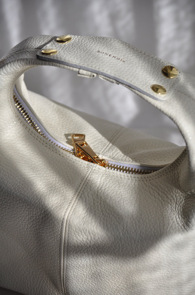 Is a leather handbag bag with a unique architectural design. The two handles are extended and joined together in a circle under the embossed BonendisLogo . On the side of this beautiful model is placed an adjustable leather strap, with elegant detailed stitching that alters it into a hand free body bag.