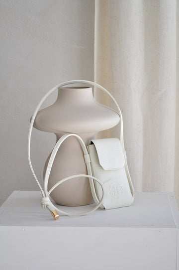 A sleek leather phone bag, refined with a knotted strap and golden accents. A discreet back pocket adds function to its elegant form — a small piece with timeless poise.