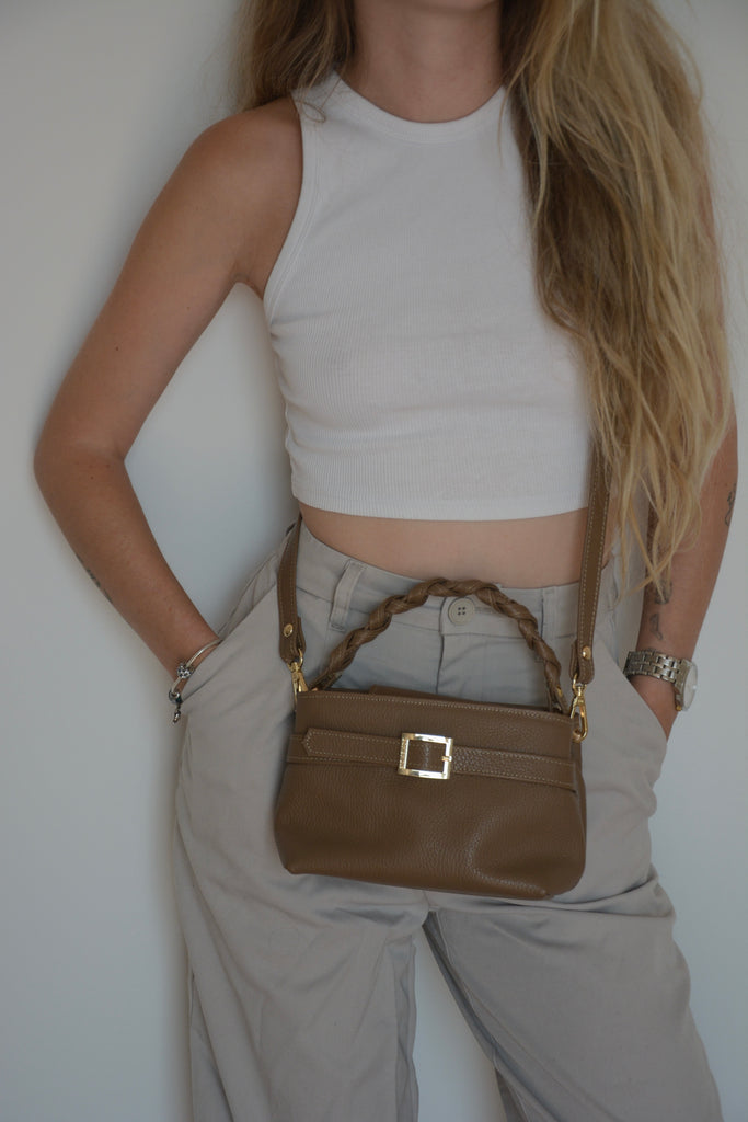Emily Mini Leather Handbag is the epitome of chic minimalism. Crafted with premium leather, it features a unique braided top handle for a touch of elegance. Perfect for both day and night, this compact bag adds effortless style to any outfit.