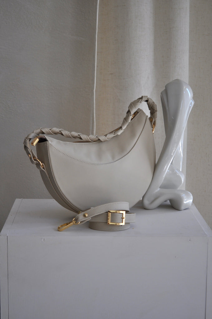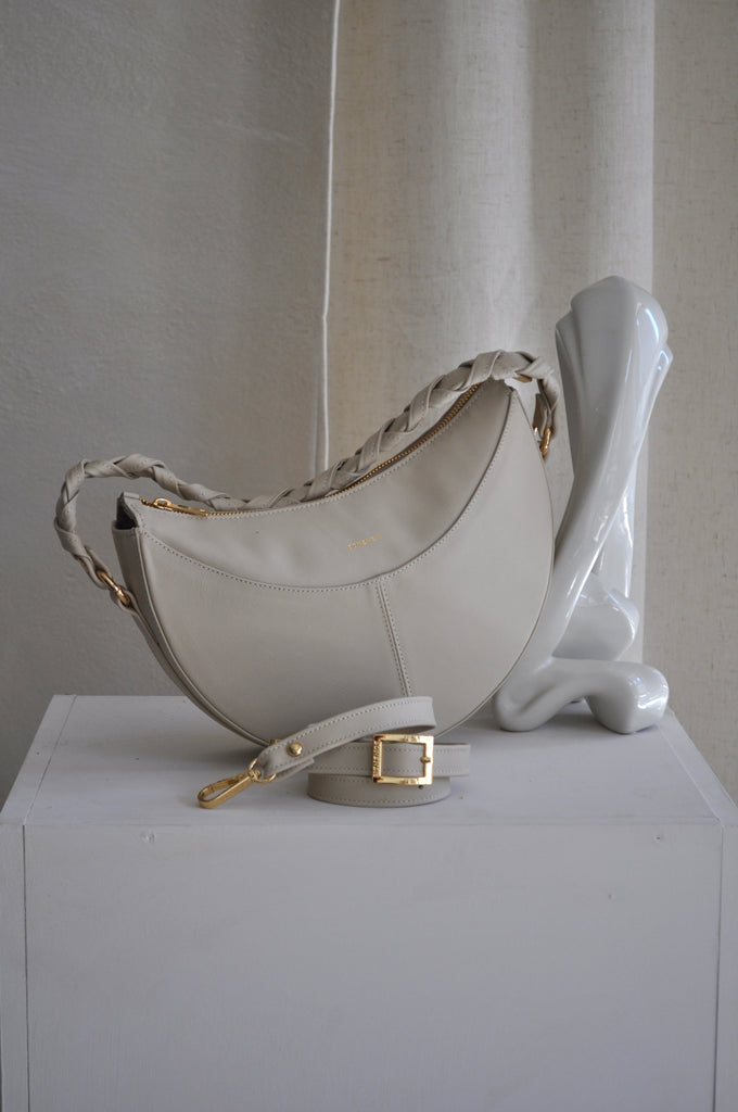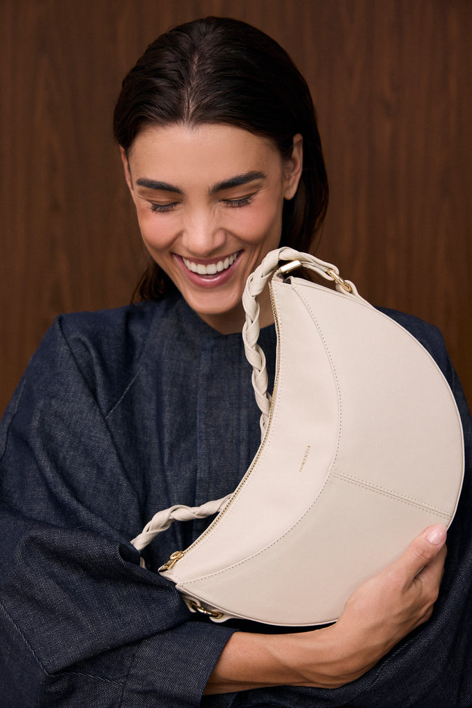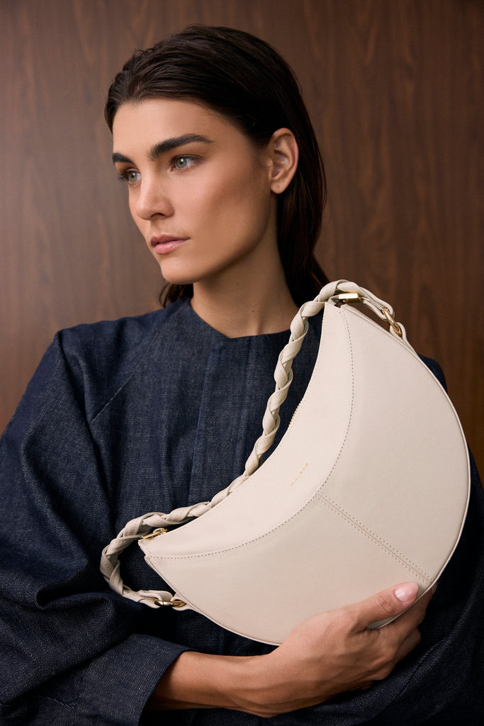 Sophie is the bag that combines uniqueness and elegance. With its distinctive half-moon shape, it can be worn both as a cross body and a shoulder bag, while its unique woven leather handle elevates any outfit with style.